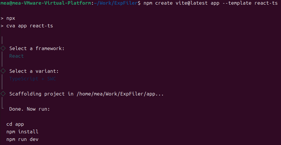 npm create vite@latestコマンドの後にいくつか質問されますので、以下のように選択していきます。