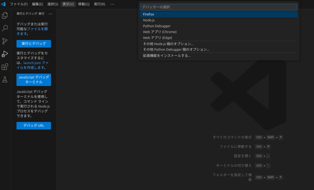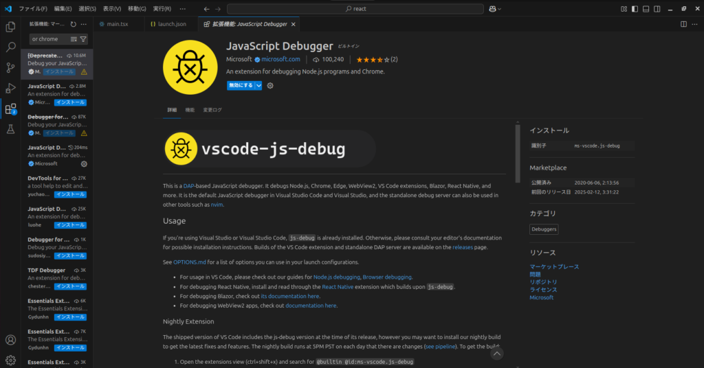 今回はChromeを使用してデバッグ環境を作成します。Debugger for Chromeは非推奨になったようで、標準で?インストールされているJavaScript Debuggerを使用します。インストールされていない場合はインストールしてください。