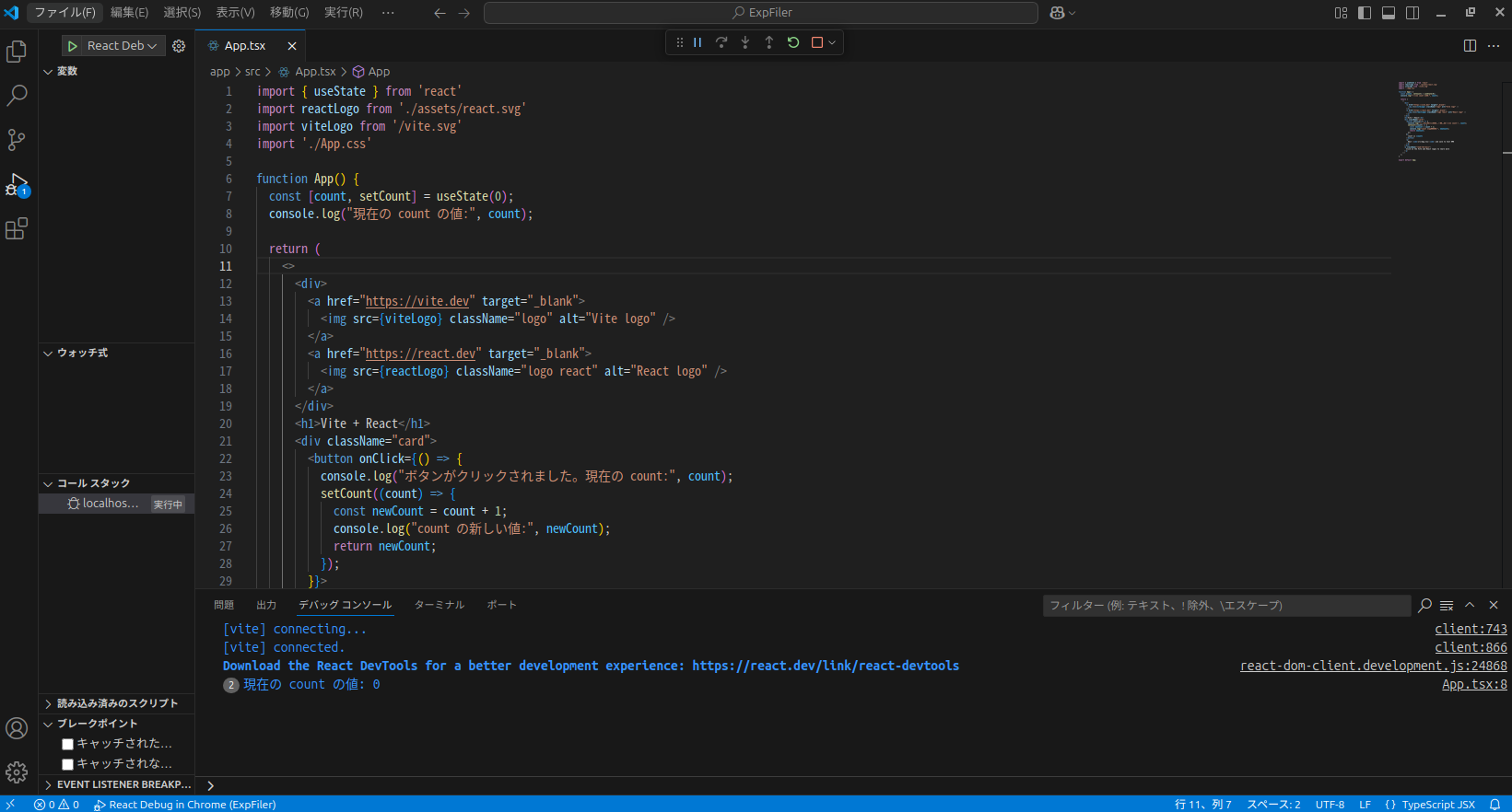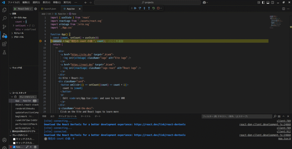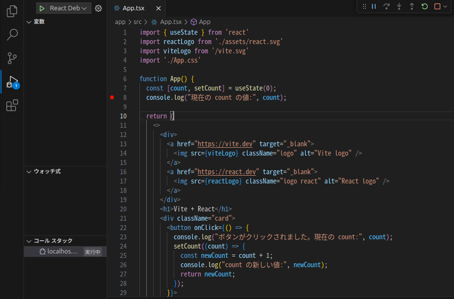 アプリを作成した時からコードは作成されているのでconsole.logをブレークポイントとして使うために追加します。